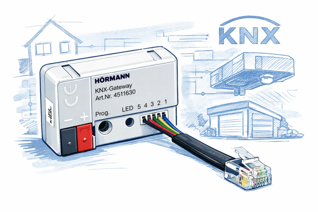Das Hörmann KNX-Gateway ist kein reines KNX-Gerät. Damit Inbetriebnahme und Kommunikation später sauber funktionieren, muss das Gateway zuerst mit dem Torantrieb verbunden werden – erst danach bindest du es über die ETS in deine KNX-Struktur ein.